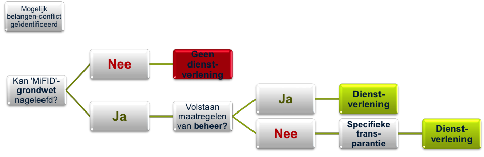 De wettelijke regeling omtrent belangenconflicten is een aanvulling op de algemene MiFID-grondwet. Deze grondwet wordt door ons kantoor geëerbiedigd door zich loyaal, billijk en professioneel in te zetten voor de belangen van de klant bij het verlenen van diensten van verzekeringsbemiddeling.